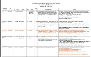 Over the past three years Ted has been compiling a table of sightings of natural re-entries of orbiting objects. Interestingly, as Ted pointed out to me, "UFO reports have proven a goldmine of previously unknown re-entry sightings. For example, UFO sighting reports in Australian government archives yielded more than a dozen previously unknown re-entry sightings."