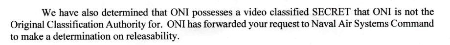 "We have discovered certain briefing slides that are classified TOP SECRET...We have also determined that ONI possesses a video classified SECRET that ONI is not the Original Classification Authority for. ONI has forwarded your request to Naval Air Systems Command to make a determination on releasability..."